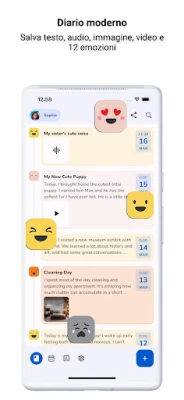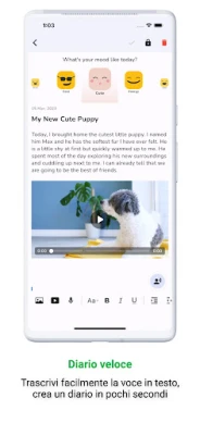 Libera la tua voce e dai vita ai tuoi racconti con "Diary with Lock". Oltre al testo tradizionale, puoi arricchire ogni pagina con foto evocative, video coinvolgenti o registrazioni audio che catturano l'essenza del momento. Dimentica la digitazione noiosa: la funzionalità di conversione da voce a testo rende la scrittura fluida e intuitiva, permettendoti di esprimerti con spontaneità. Personalizza le tue voci con una varietà di stati d'umore e adesivi, trasformando il tuo diario in un vero e proprio specchio della tua giornata e del tuo sentire, e usa le statistiche integrate per monitorare le tendenze del tuo umore.